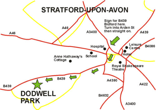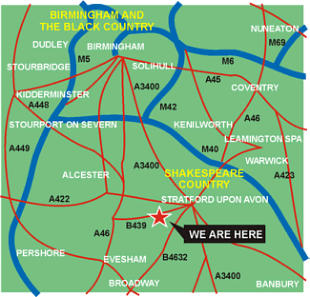 On leaving Stratford-upon-Avon, take the B439 signposted "B439 BIDFORD" for two miles. You will then find us on the left (after going over a large hill).